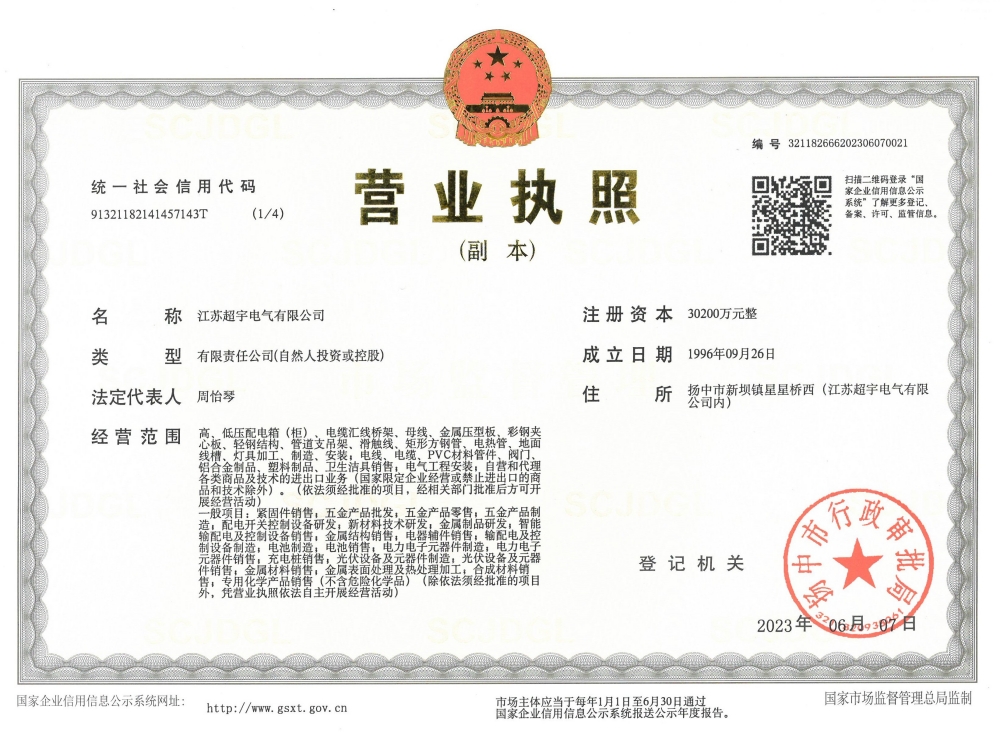 江蘇超宇電氣有限公司地處繁榮富饒的長江金三角,座落在聞名遐邇的生態(tài)示范區(qū)水上花園城市--揚(yáng)中。公司成立于一九九六年,經(jīng)過二十多年的發(fā)展進(jìn)步,目前已形成專業(yè)化生產(chǎn)制造規(guī)模。 公司現(xiàn)有注冊資金3.0... ... [詳細(xì)>>]